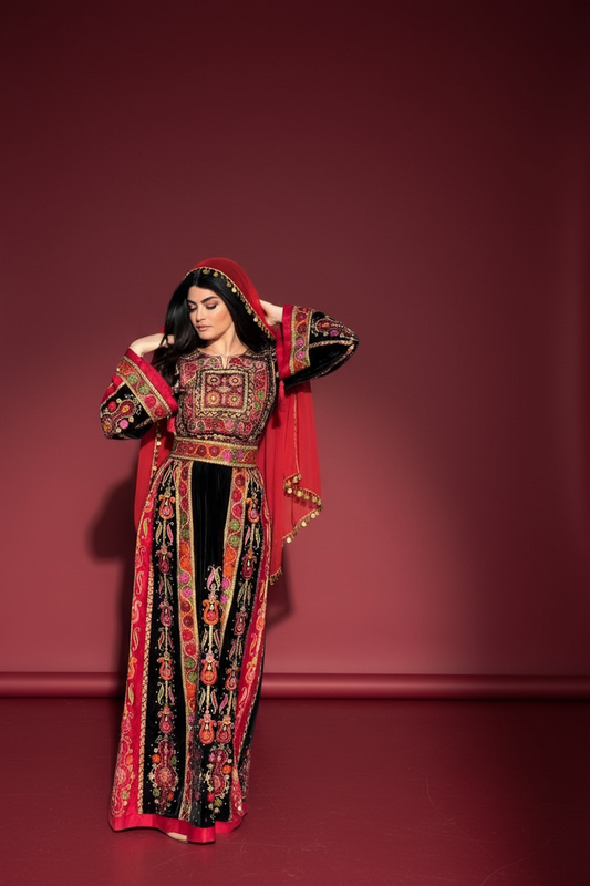 Black Velvet Malacca Red Embroidered Palestinian Fellahi Thobe