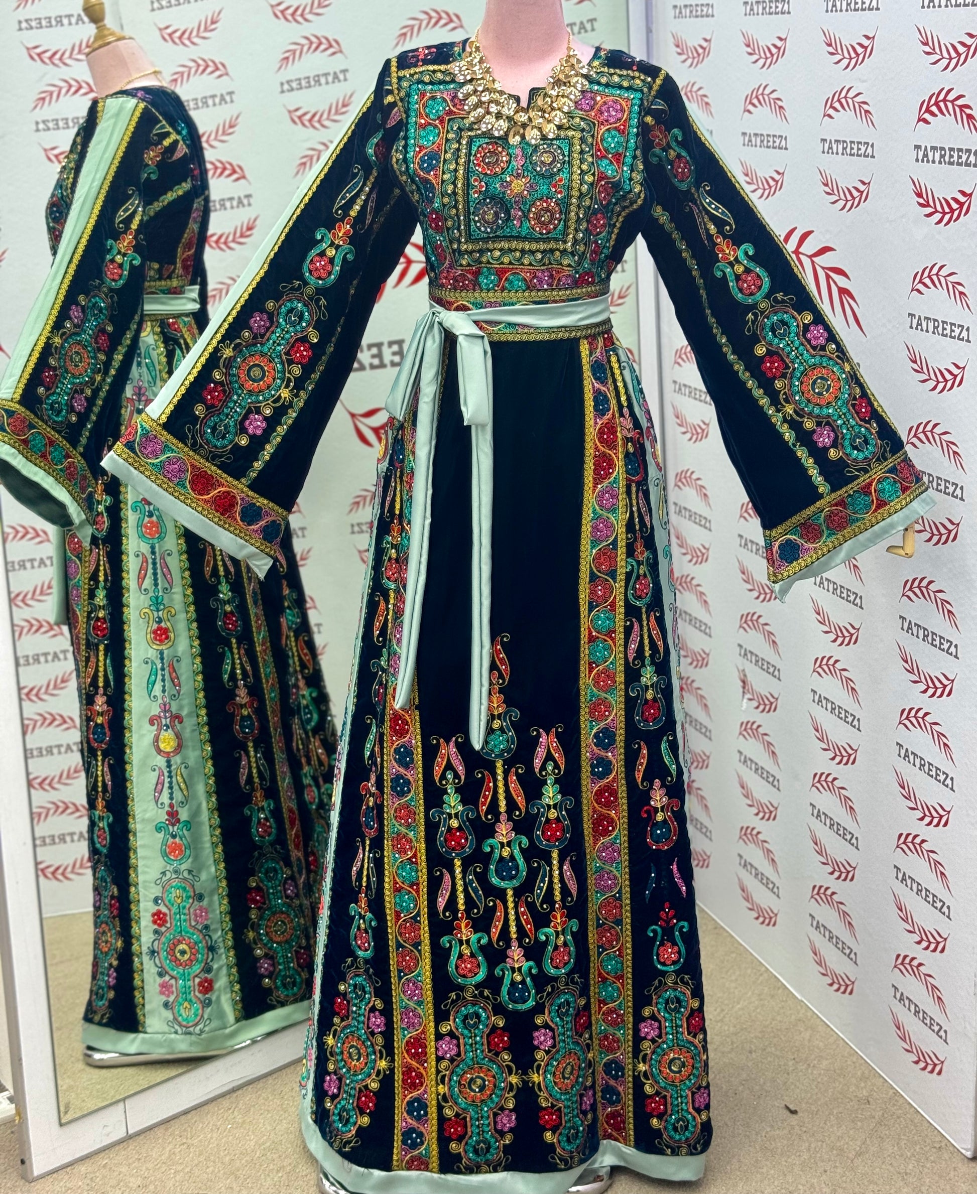 Turquoise Velvet Malacca Embroidered Palestinian Fellahi Thobe